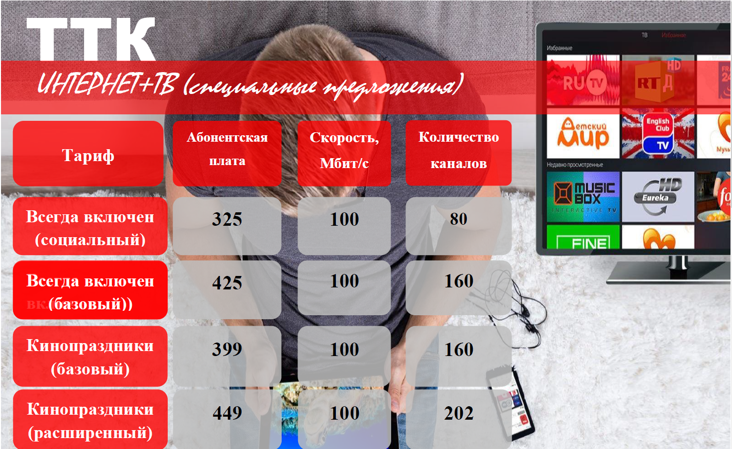 1. Тарифный план "всегда включен" (соц.) включает в себя 100мб/сек круглосуточной скорости и 80 каналов ТВ, с 3го месяца абонентская плата составляет 650 рублей .